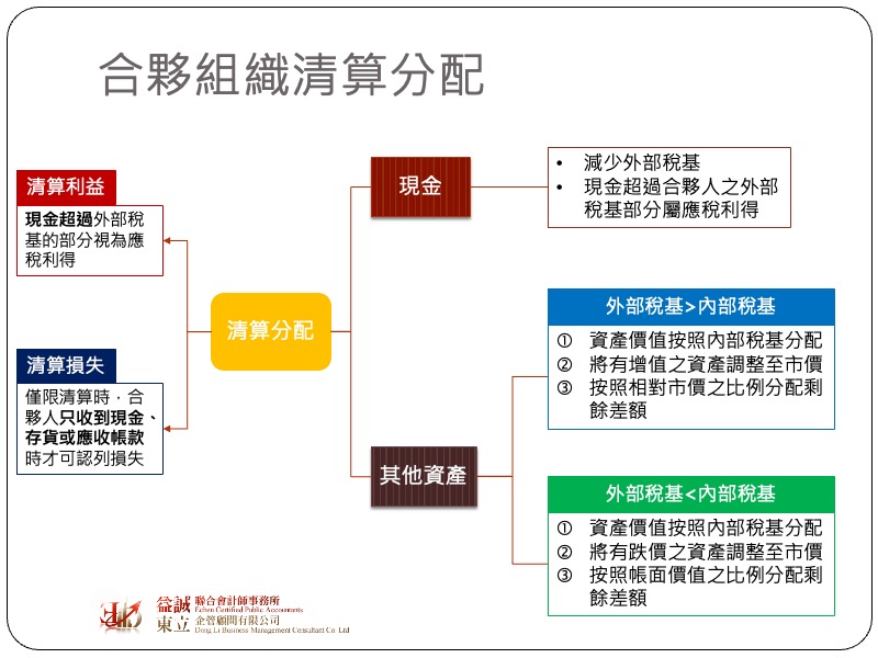 當合夥織選擇結束,跟一般公司一樣需要了結現務,清償負債,並將剩餘資產分配給股東,這個過程所做的分配我們稱為「清算分配」。普通分配與清算分配的課稅原則大致相同,差別在於普通分配並非了結合夥人的合夥權益,因此不會有投資損失之發生,但清算分配是結清合夥人的所有合夥權益,因此若分配回來的比原先持有的權益還要少,理論上就會有投資損失的情況。