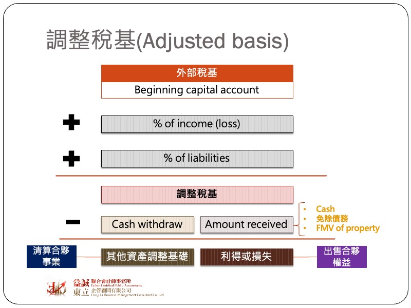 在一般狀況下,合夥權益視為資本資產,因此當合夥人將其合夥權益出售,形同處分資本資產,相關之損益則視為資本利得或損失。在計算合夥權益時,我們同樣要先確定合夥權益的稅基是多少,才有辦法進一步去計算損益,而這裡的稅基又稱為調整稅基(adjusted basis),其計算的方式是以期初的外部稅基(outside basis)加上到處份日當天,歸屬於個別合夥人的當年損益及應分攤的負債,合夥人出售權益所取得的對價扣除調整稅基就是最後的處分損益。