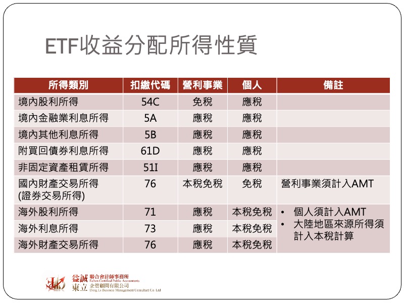 如果ETF投資標的是境內股票,這類的財產交易所得其實都屬於免稅所得,但營利事業須特別注意,處分有價證券之所得雖然面課所得稅,但須另外計入基本稅額當中,很多營利事業誤以為ETF配息都是股利所得,而未將屬於處分股票之利得計入基本稅額中因而產生漏稅罰。很多讀者一定會有疑問,要如何知道ETF的配息是屬於那種類型的所得? 其實每年ETF都會開立各類所得扣繳憑單給受益人,上面會清楚記載配息的所得類別是屬於哪一類,只要按照上面的所得類別申報就不會有問題了!