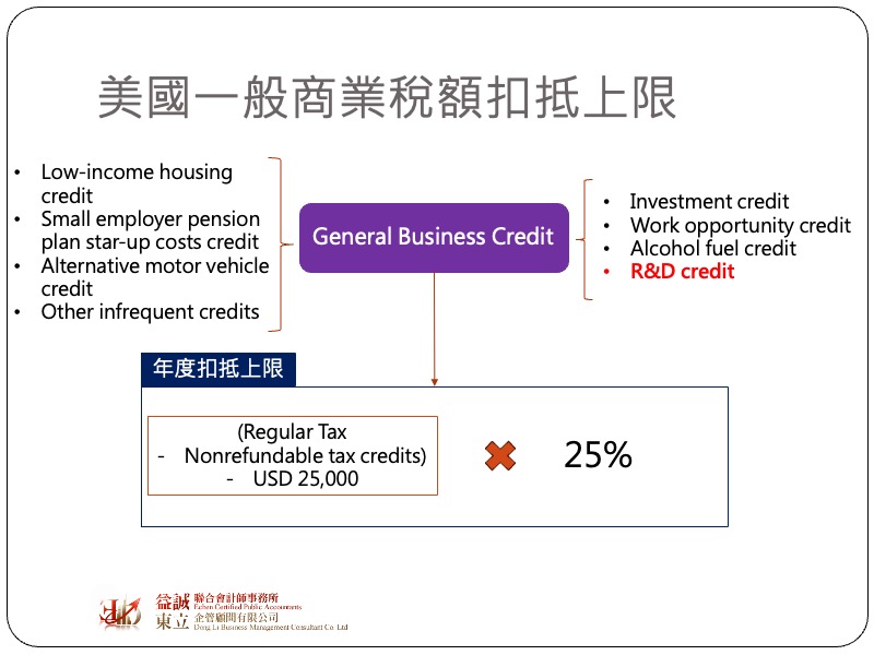 與一般個人相同,稅法同樣提供企業諸多的稅額抵減優惠,在稅務上我們通稱為”General Business Credits”,像是本文所介紹的R&D tax credit以及常見的小型企業員工退休金稅額抵減(Small employer pension plan star-up costs credit)等都屬之。由於企業在同一個年度可能會同時適用數個不同的稅額抵減優惠,雖然個別稅額抵減會有各自的規定,但凡是屬於Genral Business Credits的稅額抵減,其全年度的合計抵減數會受到整體限額的規範,其限額計算的方式是以淨應納稅額(Net regular tax)扣除USD 25,000後之25%為扣抵上限。R&D tax credit若超過當年度的抵減上限,可選擇將未用完之tax credit前抵1年或後抵20年。