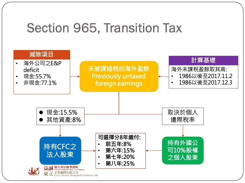 為了解決長久以來納稅義務人透過受外國控制公司(CFC)將盈餘留在海外而未分配回美國來達成稅負遞延的行為,美國國會在2017年通過了Tax Cut & Job Act(TCJA,又稱川普稅改)法案,在稅法中新增Section 965章節,針對所有美國企業或個人持有之海外公司未曾課過稅之盈餘課徵一次性的所得稅,這就是有名的Section 965 Transition Tax。