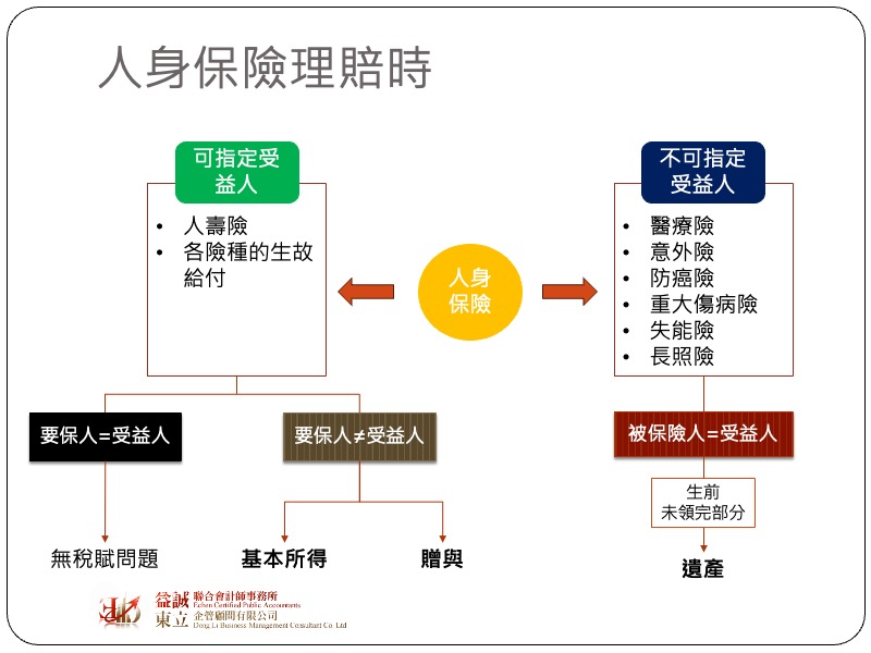 國外的醫療險多半是單純保障類型的商品,但台灣早年因為風俗民情的不同,許多人沒辦法接受繳了保費,如果沒有出險,未來拿不回東西,所以台灣的醫療險產品可能會設計成具有「還本」功能的保單,而這樣的保單可以把它看成是一個單純健康險+一個人壽險的組合。既然有了壽險,這張保單就會有保單價值準備金,與醫療險不同,壽險是可以指定受益人,所以被保險人過世的死亡給付原則上是不會變成遺產,但該死亡給付金額超過3740萬的部分必須計入個人基本所得額當中。依據保險法個精神,保單是屬於要保人的財產,所以有價值準備金的保單,當要保人變更就會有贈與的問題。最後提醒一個重要觀念,要保人與受益人不同的人壽保險,當保險給付發生時,原則上會視為要保人將其所繳保費之累計利益(保單價值準備金)無償贈與給受益人,因此如果保單當中有約定保險滿期金、生存金等條款,就必須注意若這類受益人並非要保人本人,在給付時就會有贈與稅的問題。