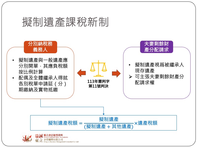 為此新的作業原則規定,如果被繼承人有死亡前兩年對配偶之贈與,該部分的贈與需視為遺產,但同時配偶的剩餘財產分配請求權也可同步將該「擬制遺產列入」,且既然該擬制遺產以實質上由配偶一人所取得,因此額外贈加的遺產稅也必須由配偶單獨繳納。