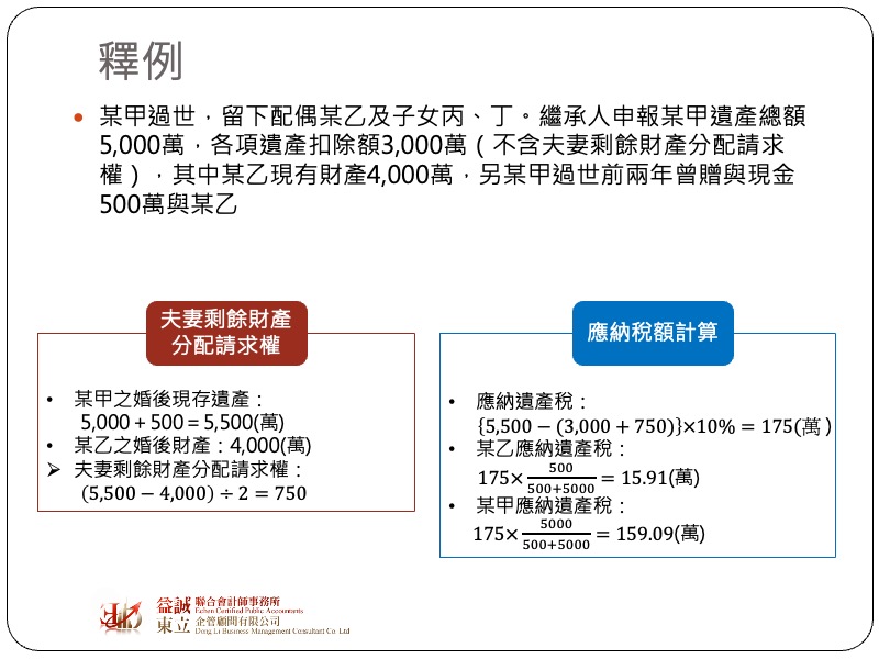 某甲過世,留下配偶某乙及子女丙、丁。繼承人申報某甲遺產總額5,000萬,各項遺產扣除額3,000萬(不含夫妻剩餘財產分配請求權),其中某乙現有財產4,000萬,另某甲過世前兩年曾贈與現金500萬與某乙。在新制中,因為生前贈與500萬為擬制遺產,所以某甲的遺產總額為5000+500=5500萬,而某乙的現有財產為4000萬,因此夫妻剩餘財產分配請求權為(5500-4000)/2=750萬,應納遺產稅總額為(5500-3000-750)*10%=175萬。其中屬於擬制遺產的部分為175*500/5500=15.91萬,這部分必須由配偶單獨繳納,剩餘的159.09萬才是由全體繼承人共同繳納。