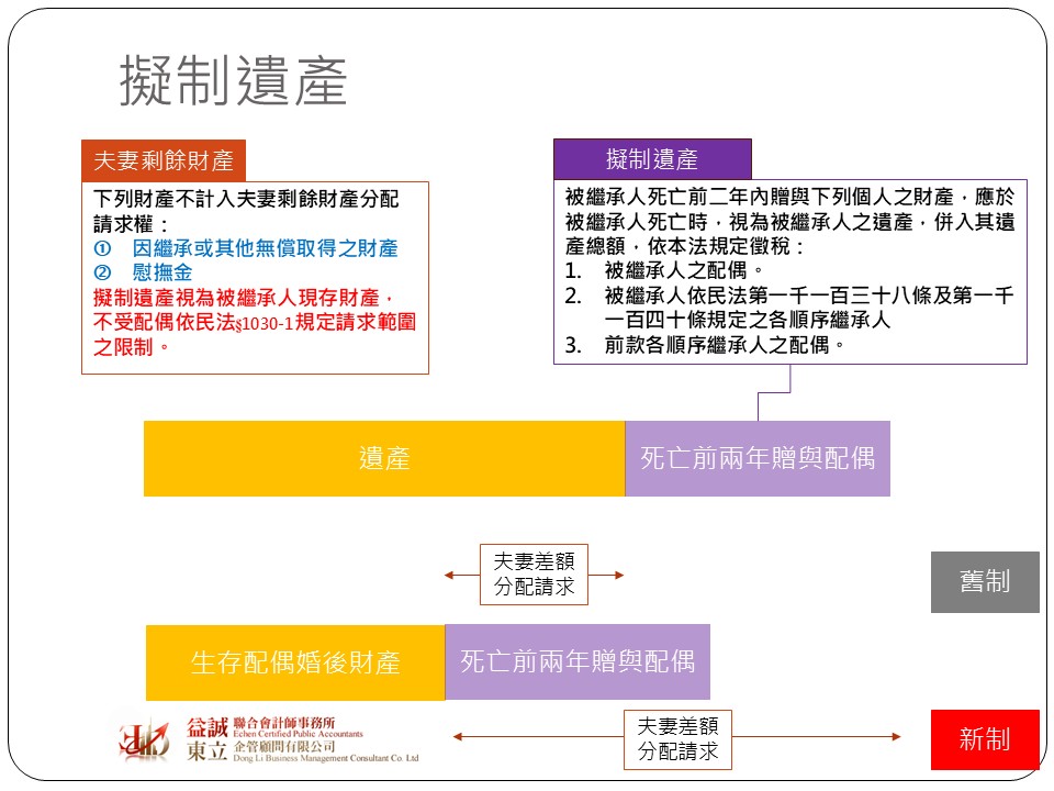 這次所頒布之處理原則中對於傳承規劃影響最大的是在於擬制遺產可視為被繼承人之現有財產之規定。由於民法§1030-1規定,因繼承或其他無償取得財產及撫卹金不做為夫妻剩餘財產分配請求權,但遺產稅法15條卻又規定被繼承死人亡前兩年對配偶之贈與需視為遺產,這就出現一個過去傳承實務上很常出現的地雷,也就是夫妻死亡前2年的贈與會被額外課徵遺產稅(因為夫妻間贈與不課贈與稅,因此無法用以抵減日後的遺產稅),但如果什麼事情都不做,卻有機會主張夫妻剩餘財產分配請求權。舉例來說,某甲現有財產5000萬,其配偶某乙之財產為1000萬,如果某甲在過世前兩年贈與1000萬財產給某乙,當某甲過世時其財產剩4000萬,某乙的婚後財仍是1000萬(因為受贈財產不計入婚後財產),夫妻剩餘分配請求權為(4000-1000)/2=1500萬,因此某甲的遺產淨額為(4000+1000)-1500=3500萬;然而如果某甲“什麼都不做”在其過世時,夫妻剩餘財產分配請求權為(5000-1000)/2=2000萬,遺產淨額減少為5000-2000=3000萬