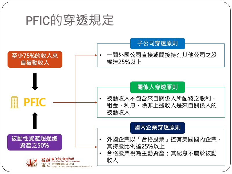 好加在稅法對於PFIC之認定除了收入測試及資產測試外,另有三個重要的穿透原則需考量,也就是說若符合條件,在進行收入測試及資產測試時,除了直接持有的外國公司外尚需計入穿透原則下所包含的其他個體之資產與收入,在這樣的情況下,若穿透個體本身有大額的主動收入,也許最終測試結果可避免被認定為PFIC,以下是三個穿透原則之介紹: