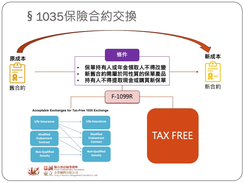 而依據IRS的規定,下列型態的保單轉換可被視為合格的同性質保單轉換享有遞延繳稅的優惠: