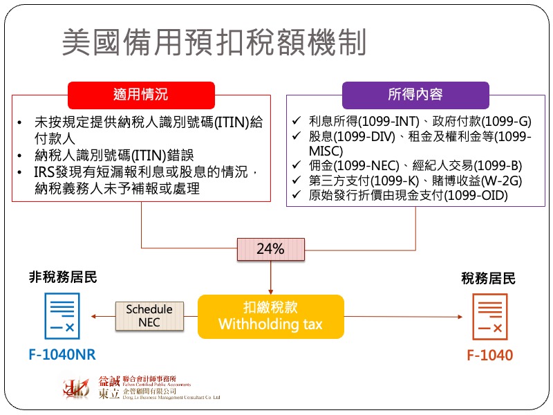 一般來說像是利息所得、股息、租金、權利金、佣金、透過經紀人交易之資本利得、賭博收益、透過第三方支付取得之款項等1099類的所得都屬於backup withholding扣繳的範圍。