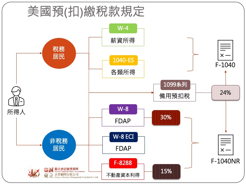非稅務居民僅就美國來源所得課稅,而美國來源所得可分成FDAP及ECI兩大類,如果是屬於利息、股息、租金收入等FDAP,依照稅法之規定,給付人須就該等收入預扣30%的所得稅;如果是ECI,則不須扣繳,但該非稅務居民必須在次年度報稅期間將該類所得申報於1040-NR中計稅;但如果是處分不動產所產生之資本利得,雖非屬FDAP,但仍須就處分資產之收入預扣15%的稅金。外國非稅務居民如果要適用上述的扣繳機制,並僅就美國來源所得納稅,必須在所得發生前就先填寫W-8表格給給付方,該表格是向給付方表明本身是非稅務居民;如果被認定是稅務居民,那就必須填寫W-9表格,該表格內容包含所得人的稅號、地址等課稅資訊。