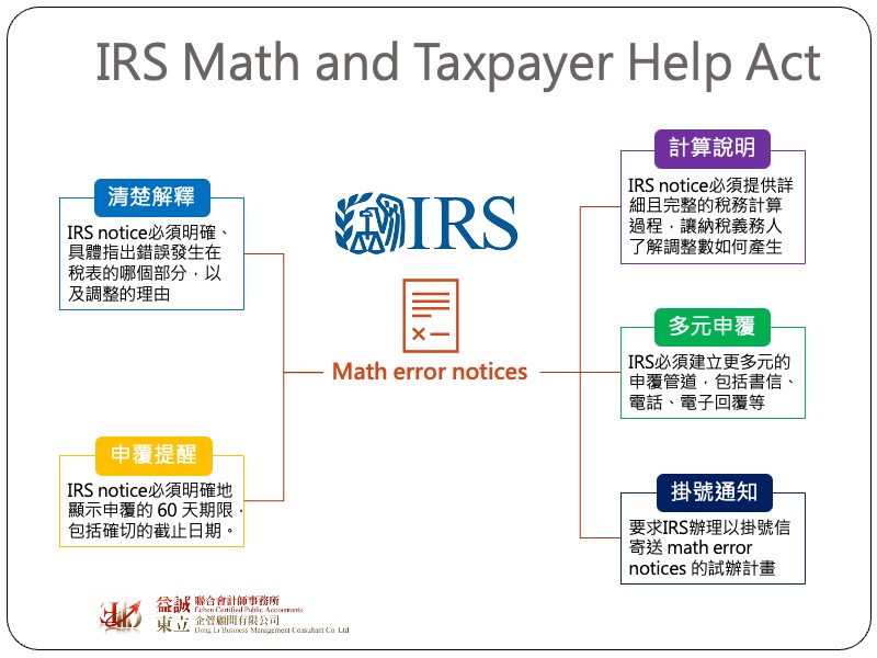 為了解決這些爭議,並且保護納稅義務人權益,美國國會在2025年年底通過名為” Internal Revenue Service Math and Taxpayer help Act (簡稱IRS Math Act)”的法案,要求IRS對Math error notice的寄發內容需有更完整明確的規範,其具體內容如下: