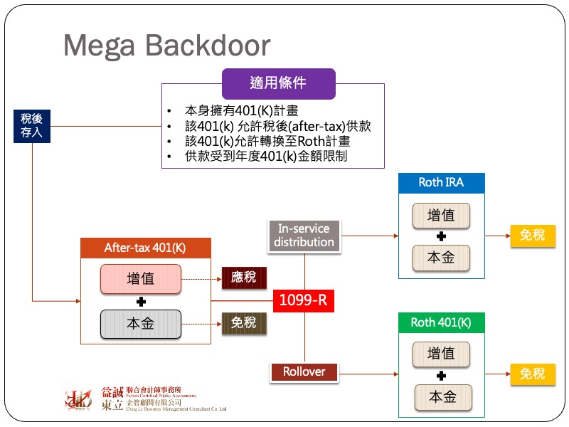 上次有跟讀者介紹高所得族群可透過backdoor的方式繞過稅法對於Roth IRA的提撥限制,今天要再來介紹另一種高所得族群常用於放大Roth退休金提撥的方式,稱為「Mega Backdoor」。由於Roth退休金享有投資增值免稅的優惠,所以對於長期持有具有資產增值效果的投資人來說特別具有吸引力,但稅法對於Roth每年的提撥數額訂有上限,如果本身有參加公司設立的401(K)計畫,就有機會透過Mega Backdoor的方式來額外增加Roth的提撥數。